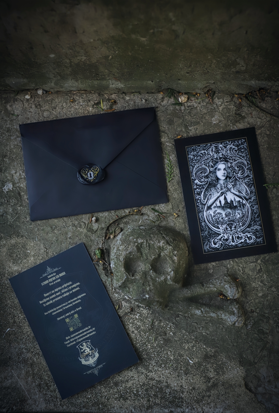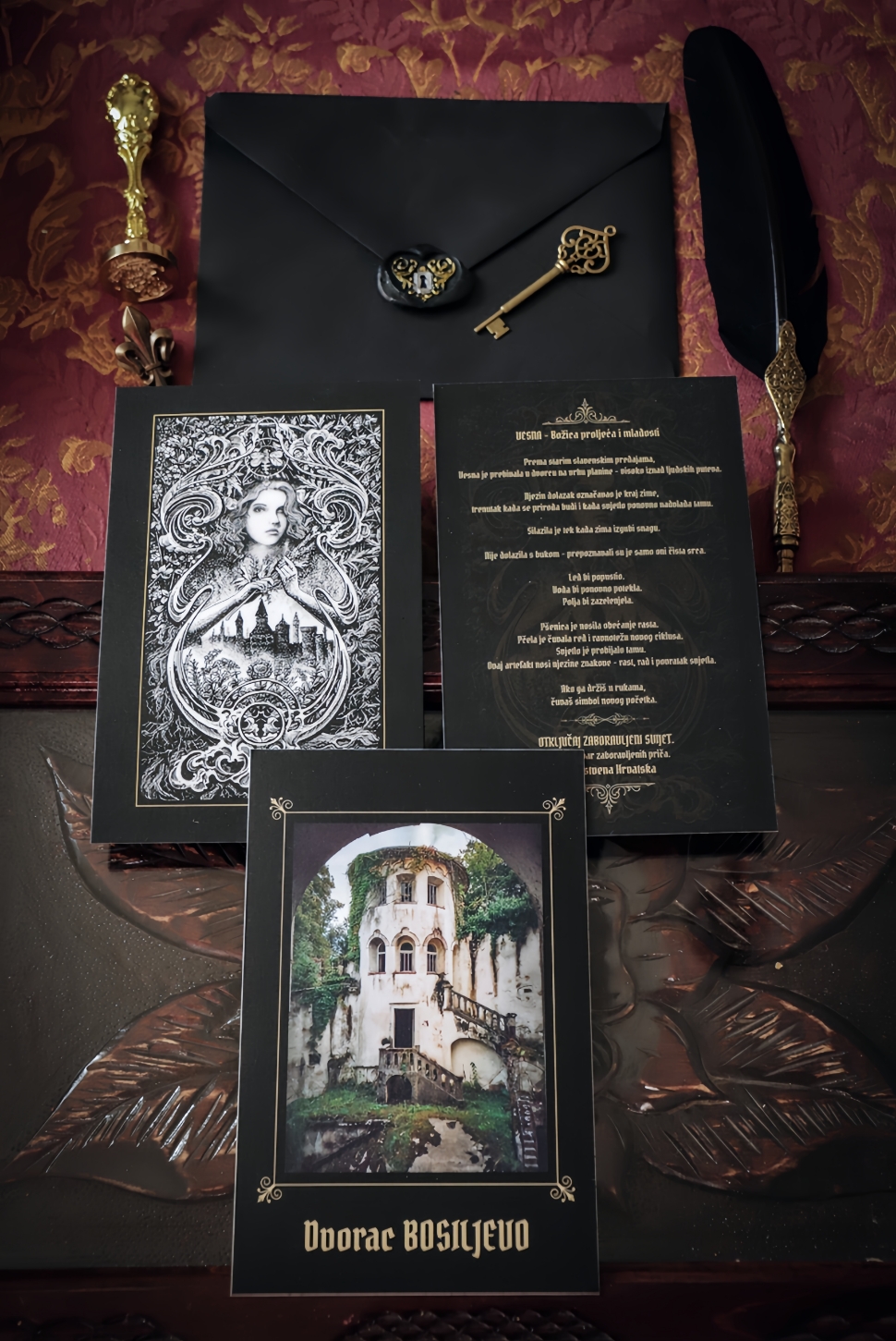 Unutar zapečaćene crne kuverte nalazi se:kartica s pričom i ilustracijom Vesne